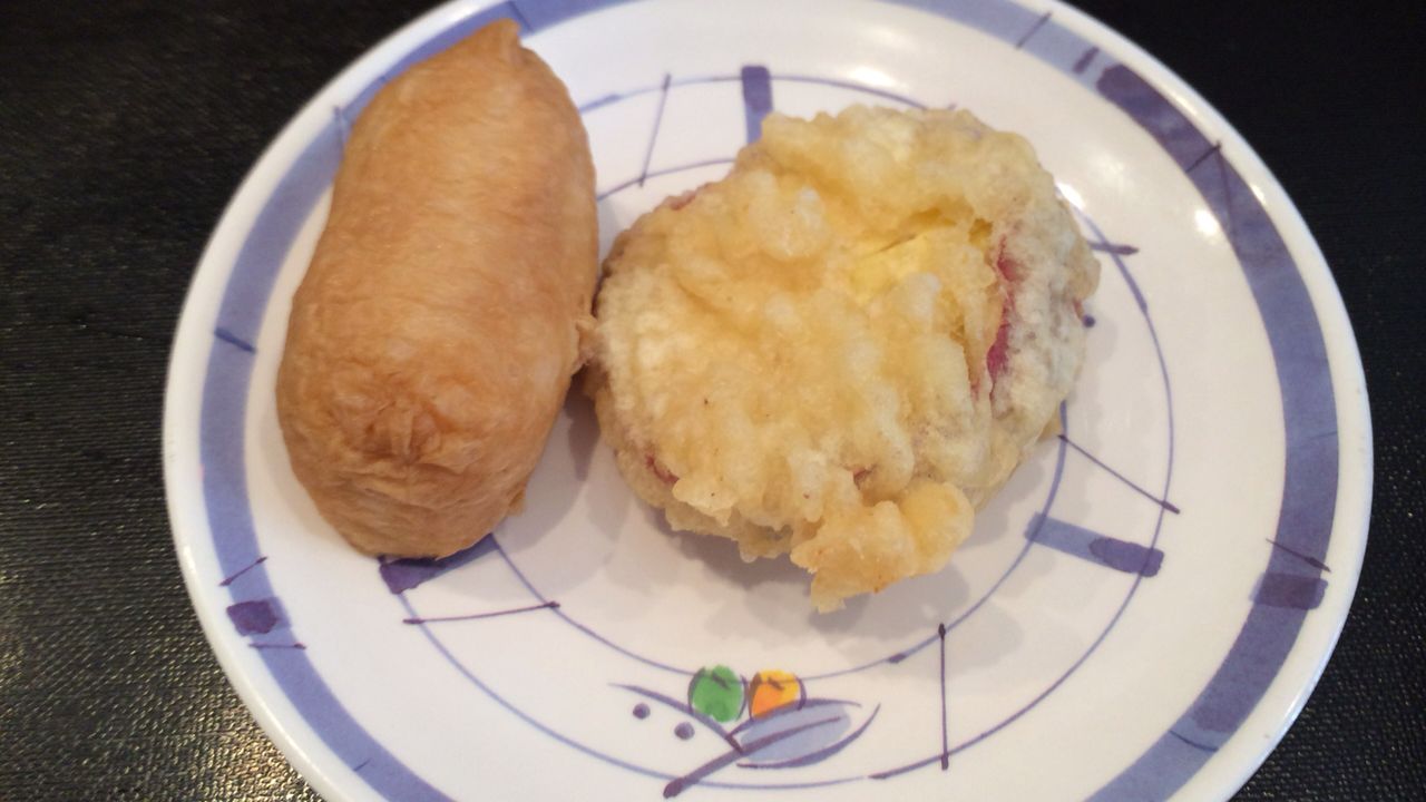 さつまいもの天ぷら(100円) ・ いなり寿司(90円)