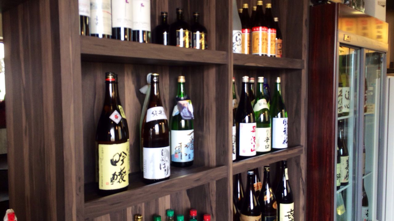 壁には、日本酒などお酒が並んでいます。