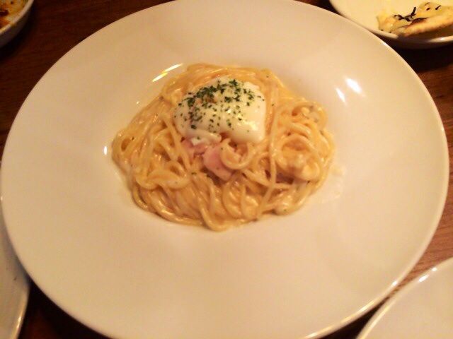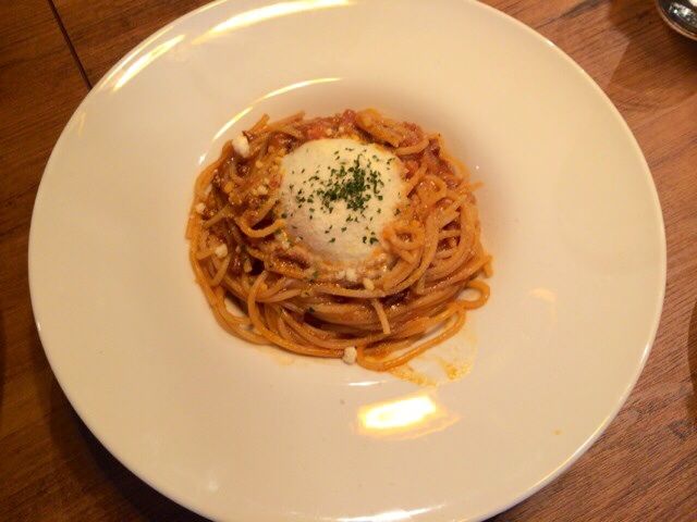 パスタの上にある半熟卵を混ぜて、いただきます。