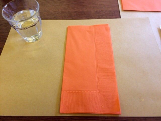 テーブルには、紙のランチョンマットに オレンジ色のナプキン。