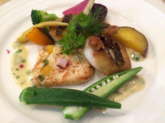 お魚と野菜がキレイに盛られています