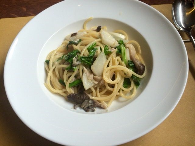 ワラサのコンフィー と きのこ・かぶのスパゲッティー
