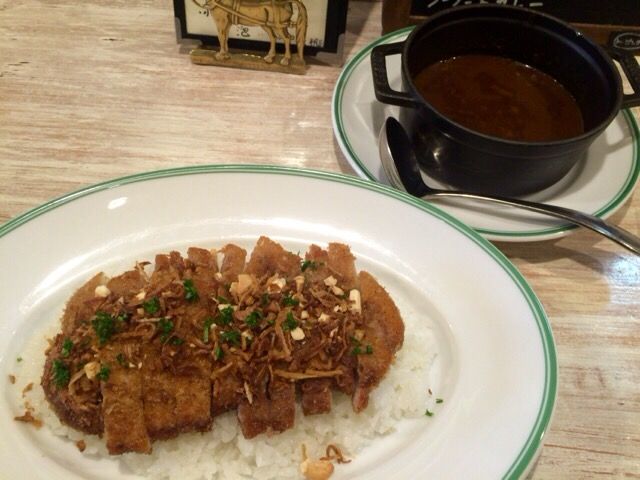 骨付きチキンカレ🐔ーと豚ホホ肉のカレー🐷を頼みましたが、お肉が柔らかく揚げ卵が半熟で、とてもおいしかったです。