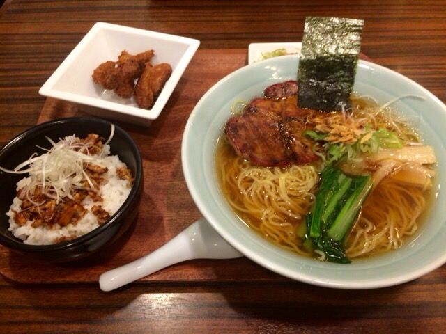醤油ラーメン + 叉焼ご飯 + 唐揚げ + 小菜 がセットになっています