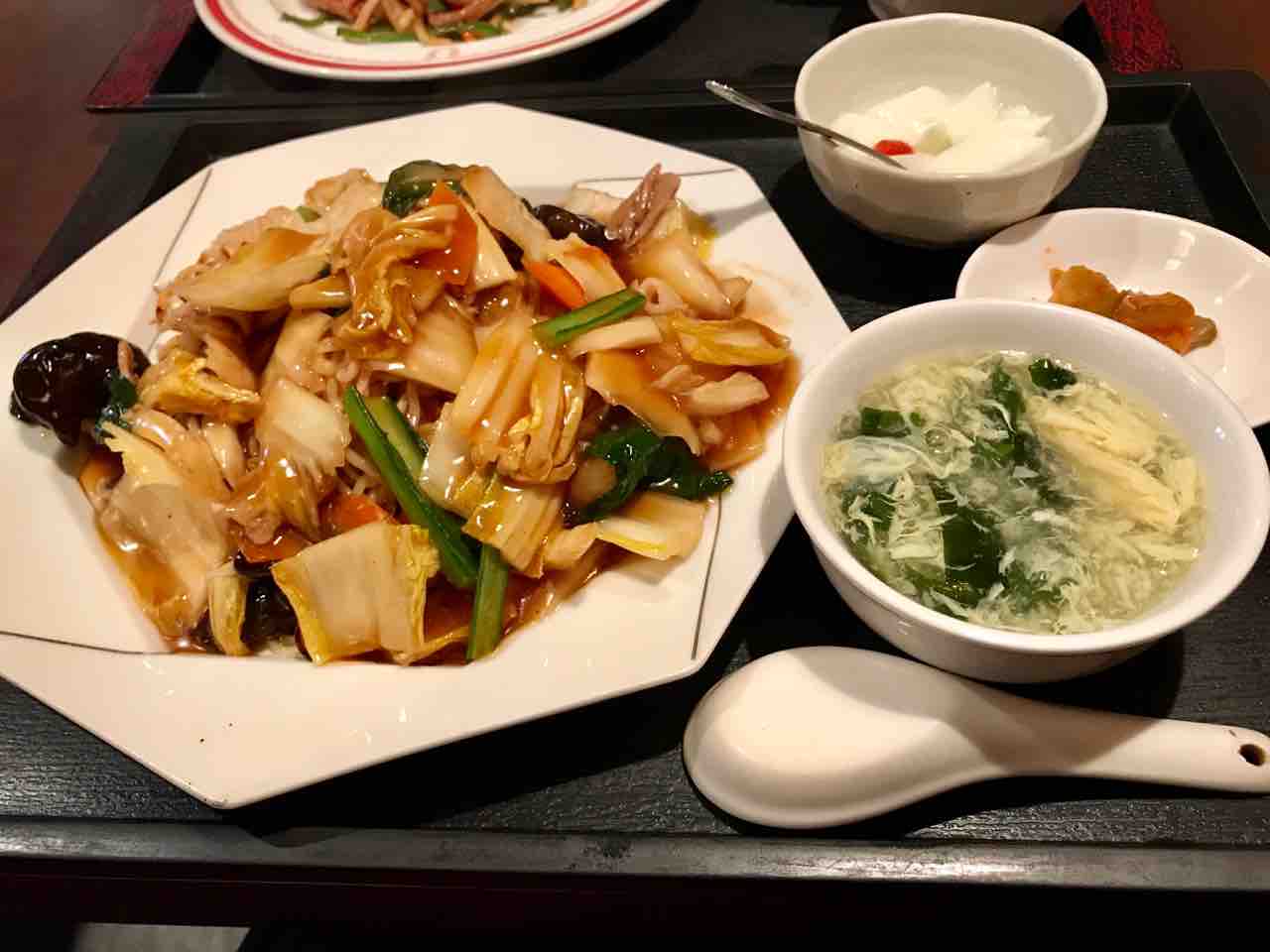 メインの他に、ご飯・スープ・ザーサイ・杏仁豆腐がついたセットです。