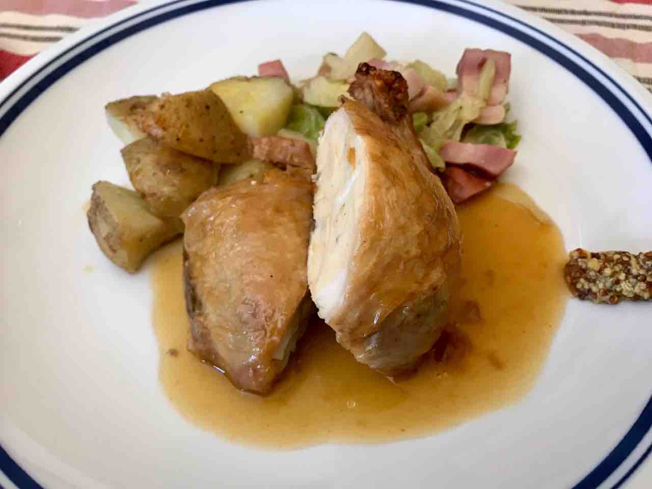 大山鶏のロースト、三浦春キャベツのブレゼと新じゃがのロースト