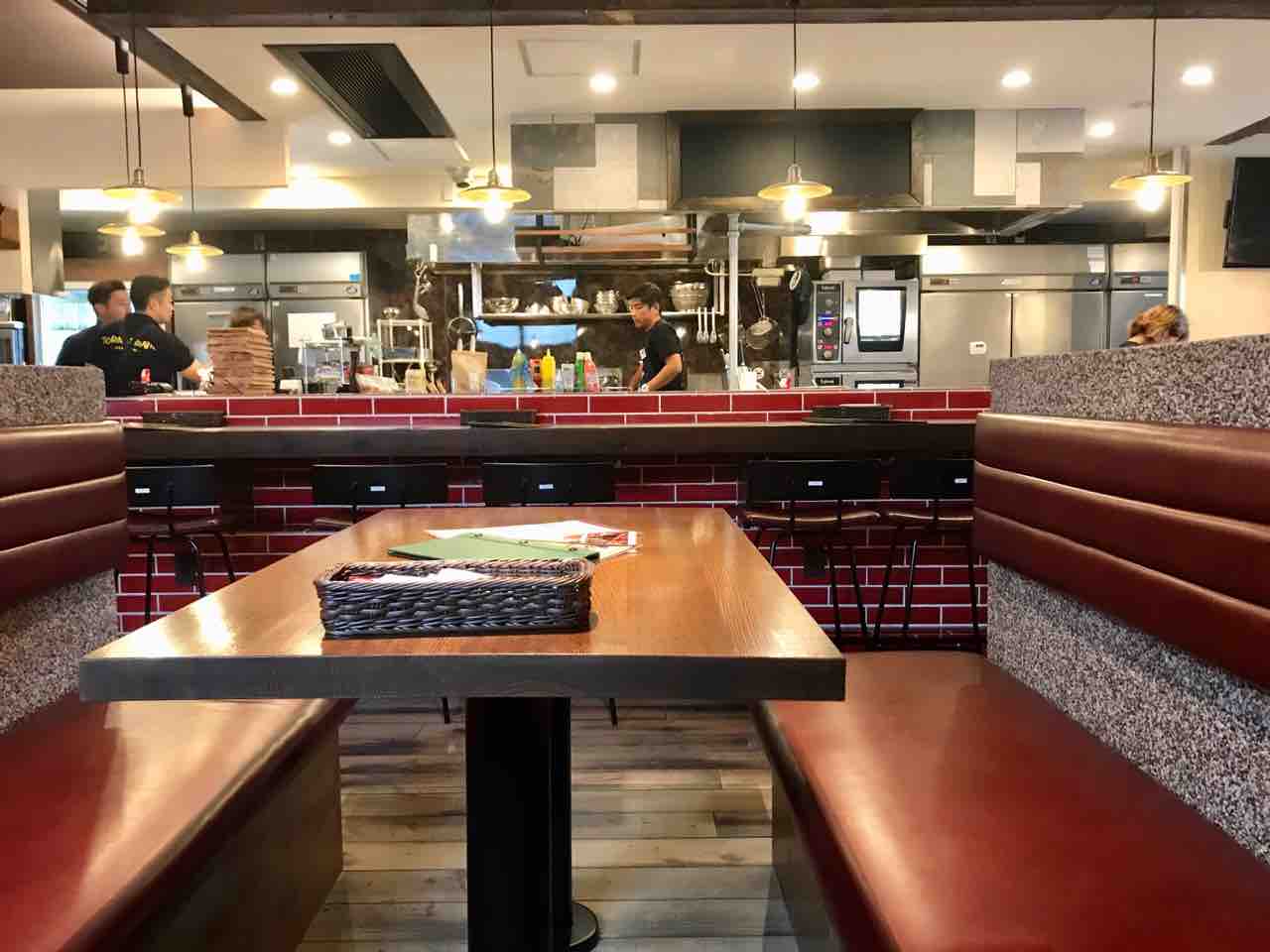 店内は、ボックス席の他にも、オープンキッチンに面したカウンター席や窓際のカウンター席などがあります。