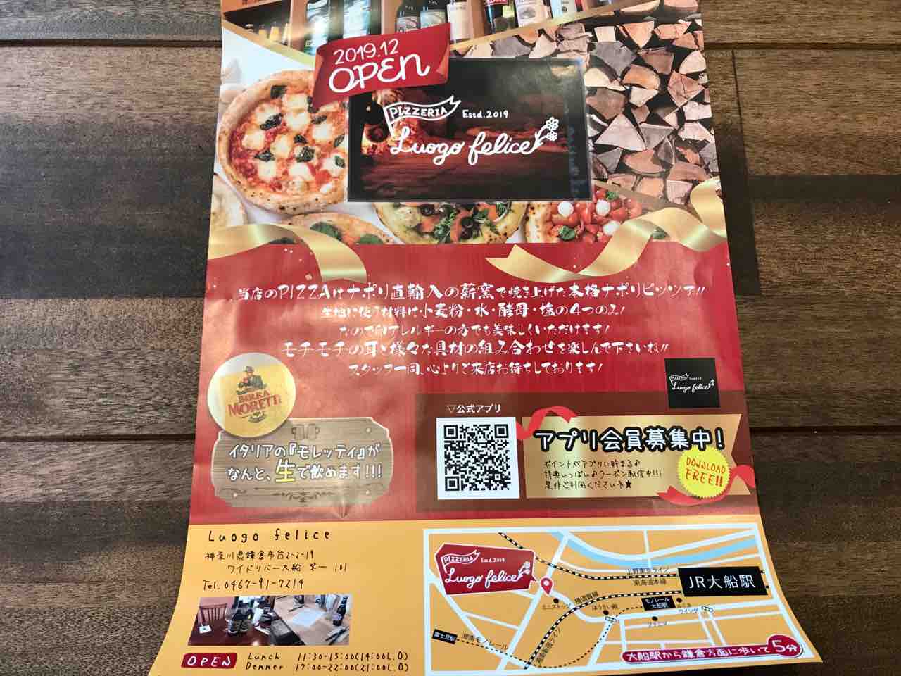 大船にイタリアのビール「モレッティ」が生で飲めるピザ屋さん、 Luogo felice(ルオーゴ フェリーチェ)がオープンしました!