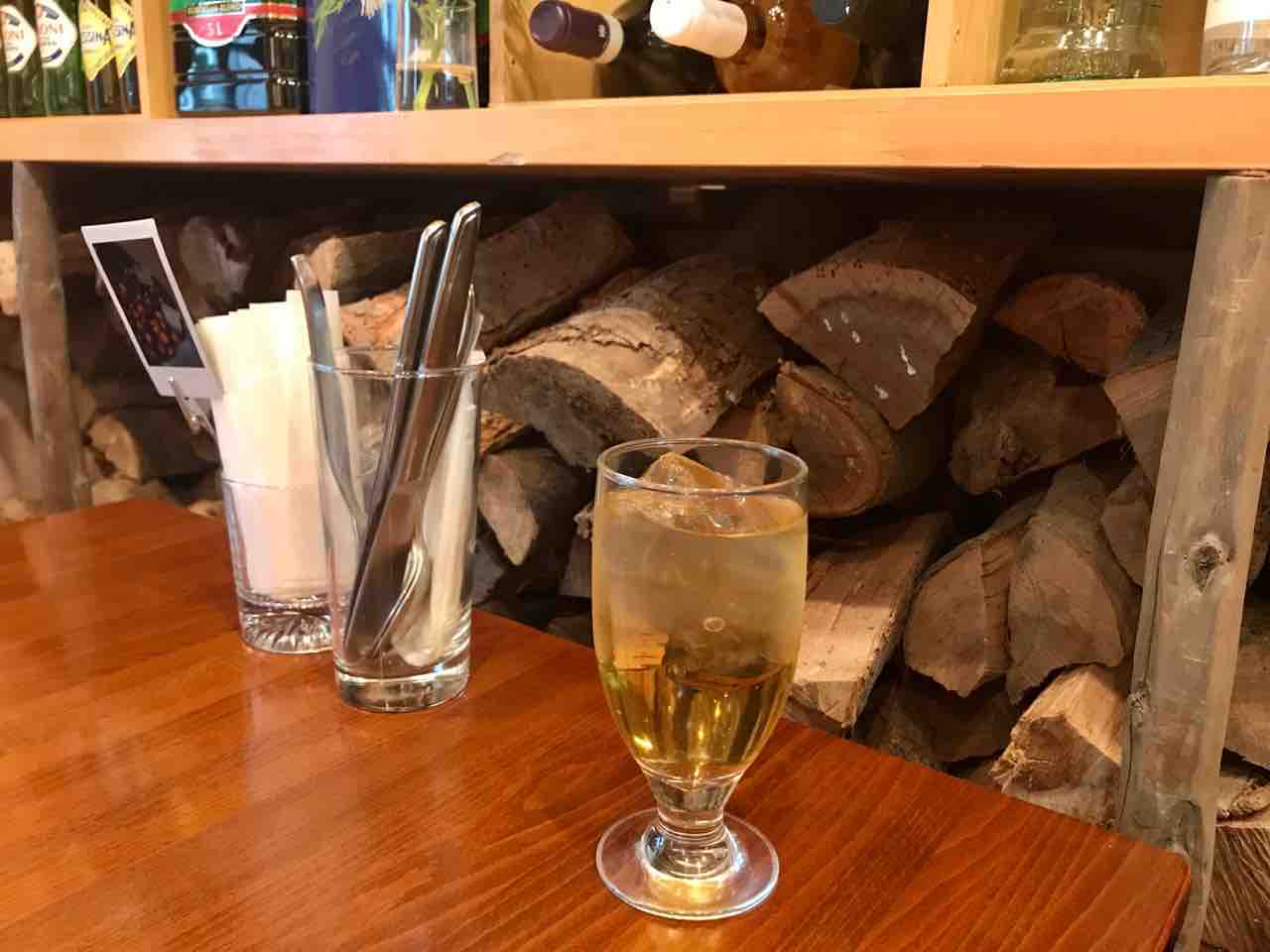 ジュースの後ろに見えるのは、薪!