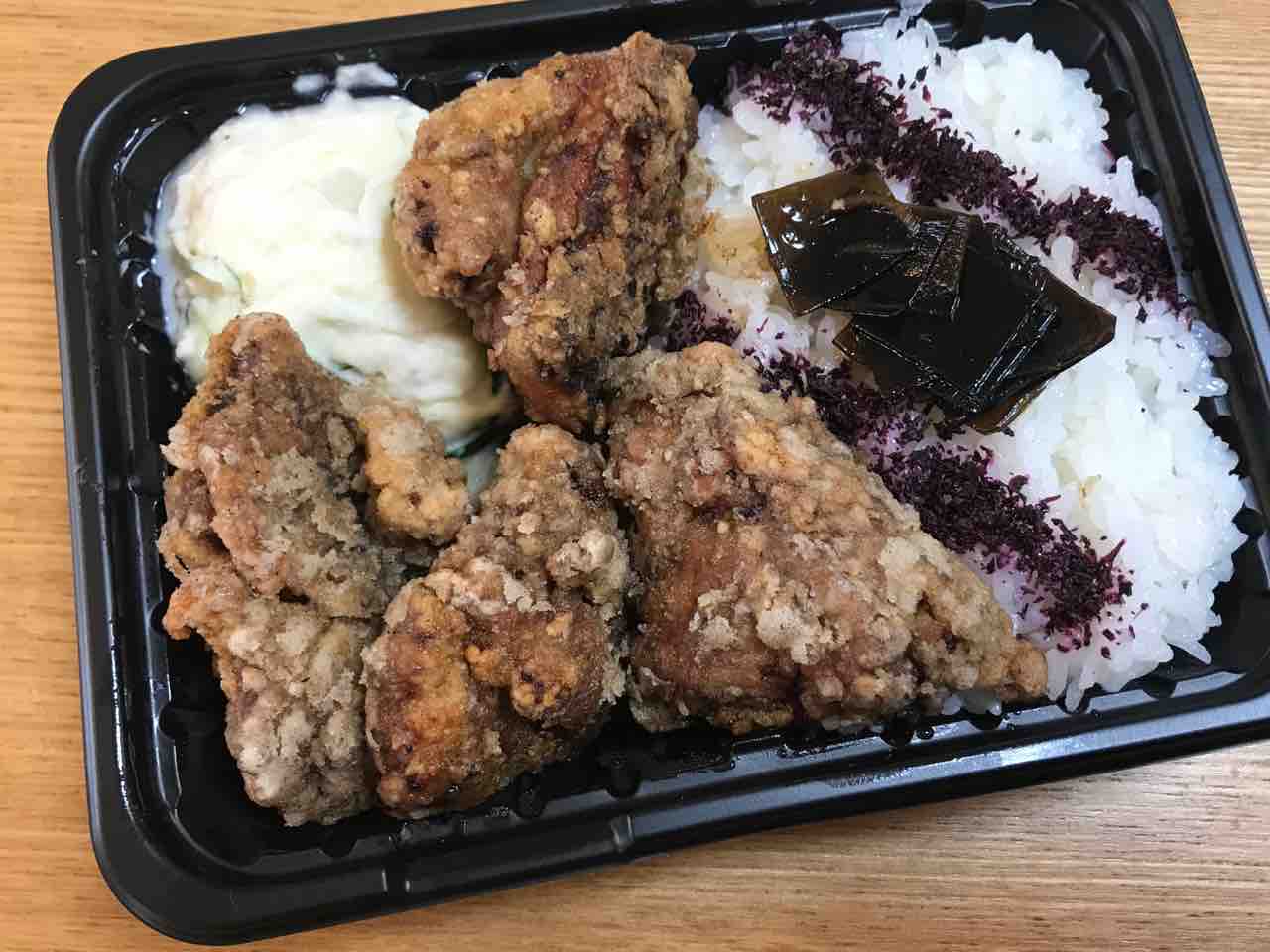 コンパクトな容器に、ごはん(ゆかり・昆布)、鶏からあげ、ポテトサラダが詰まってます!