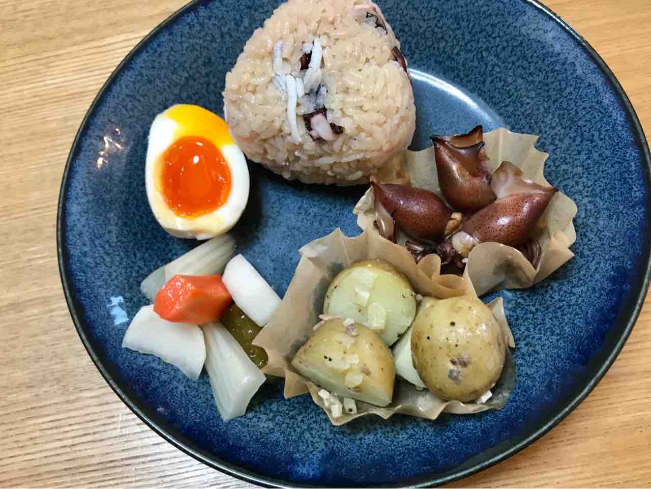 おかずは、蛍いかの燻製、味付け煮たまご、野菜のピクルス、小じゃがのアンチョビ炒め。