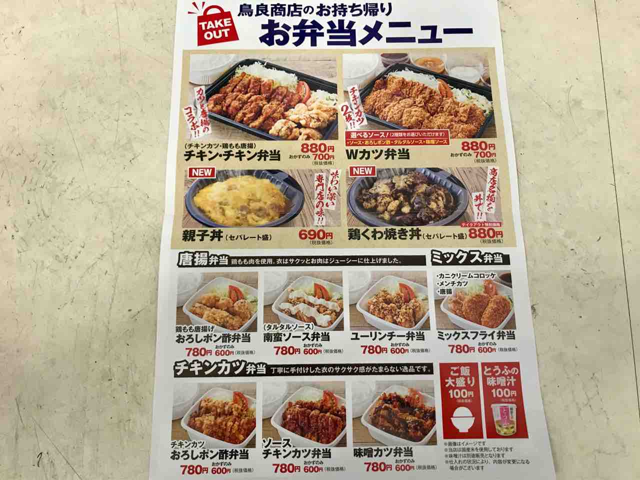 親子丼、チキン・チキン弁当、Wカツ弁当などのお弁当の種類も豊富。
