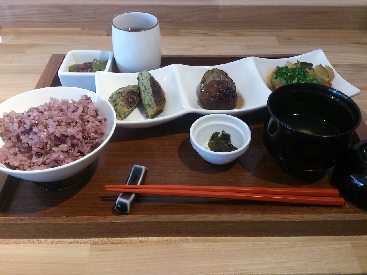 お好きな三品 ・ 根菜たっぷりスープ ・ 黒米入り御飯 ・ 箸休め ・ 小さな甘味 ・ ほうじ茶