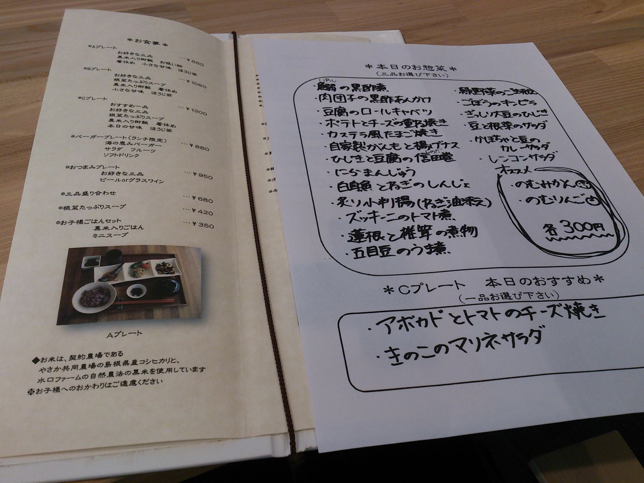 おすすめ一品 ・ お好きな三品 ・ 根菜たっぷりスープ ・ 黒米入り御飯 ・ 箸休め ・ 小さな甘味 ・ ほうじ茶